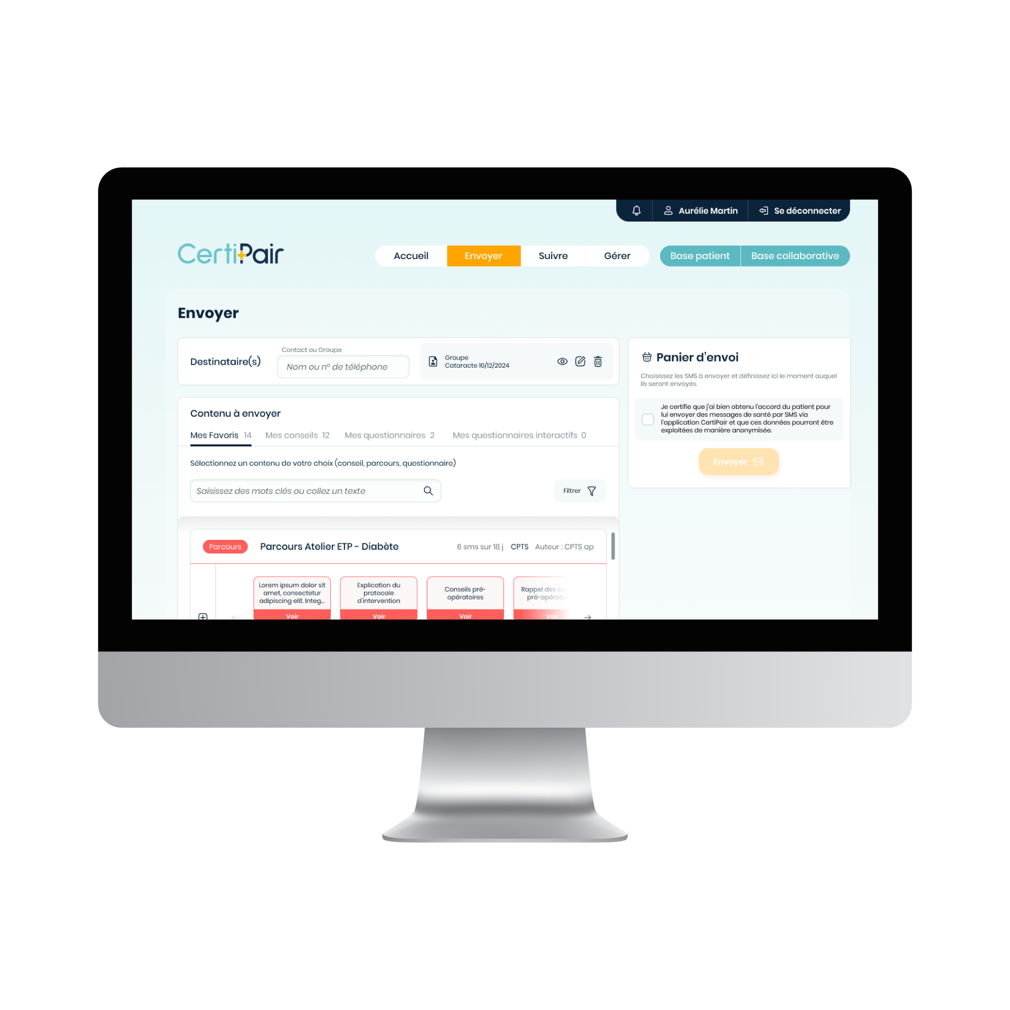 Avec CertiPair, nous avons travaillé sur la conception UX/UI d’une application de e-santé permettant aux médecins d’envoyer à leurs patients des conseils personnalisés directement par SMS. L’outil enrichit la relation médecin-patient en prolongeant la consultation grâce à des messages clairs, contextualisés, issus d’une base de connaissances collaborative.