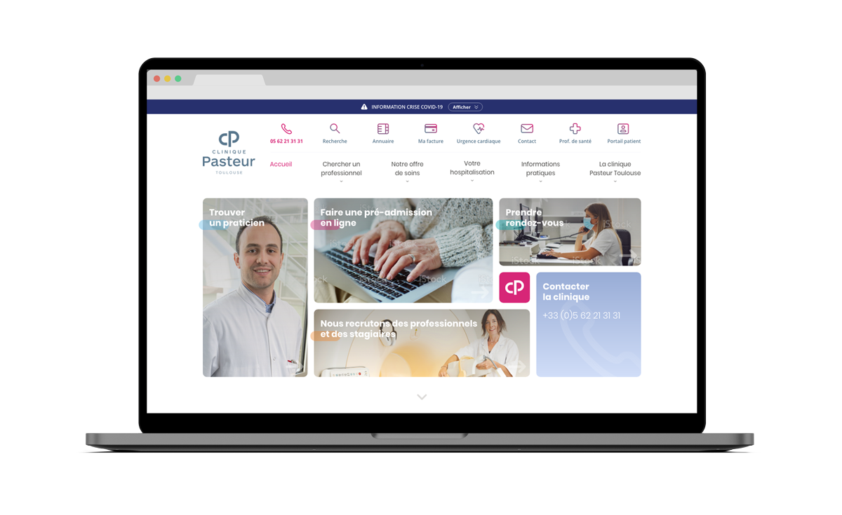 Avec la Clinique Pasteur, nous avons conçu un site Internet singulier, à la fois clair et engageant, tourné vers ses usagers actuels comme futurs. Patients, aidants, soignants et personnels administratifs y trouvent une information accessible et lisible, conçue dans une logique d’expérience utilisateur optimisée.